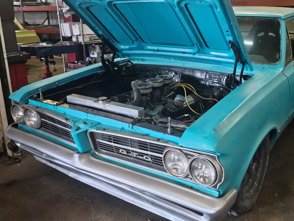 Powder blue 1964 Tempest boasting a big block 389 cubic inch V8 with 325 horsepower.